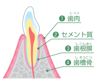 「歯周組織」は歯を支えている土台の部分のことを言い、次の4つのパーツに分かれています。