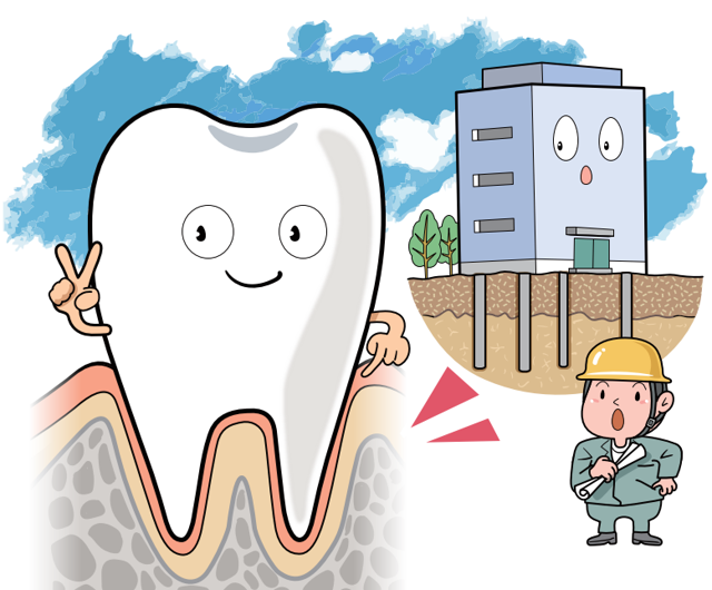 家にたとえれば、歯は柱。歯周組織はその柱を支える基礎や地面です。いくら立派な歯でも、支えが弱ってしまえば倒れてしまいます。