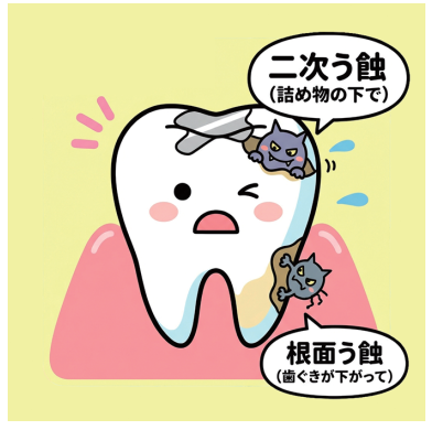 大人のむし歯は、主に歯の根元にできる「根元むし歯 (根面う蝕)」と、治療済みの歯に再発する「再発むし歯 (二次う蝕)」の2種類があります。